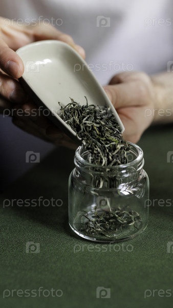 Мужчина аккуратно наливает ароматные зеленые чайные листья в прозрачную стеклянную банку, демонстрируя прекрасный момент приготовления чая