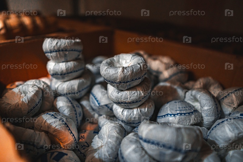 Организовал несколько сложенных упаковочных рулонов Осторожно в просторной комнате хранения