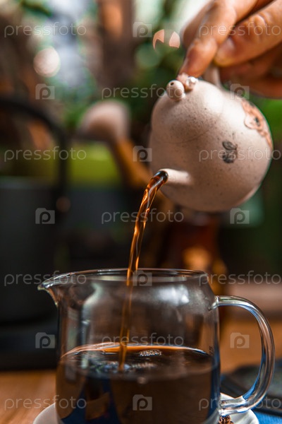 Мирный момент разворачивается, когда чай заливают из керамического чайника в стеклянную чашку, успокаивая душу