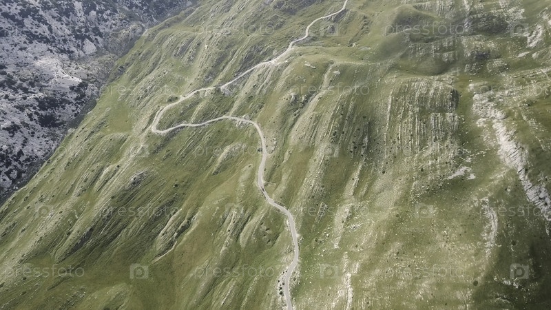 Вид сверху на горную дорогу.Сток.Опасные извилистые дороги на склонах горы.Вид на дорогу в горах захватывающий