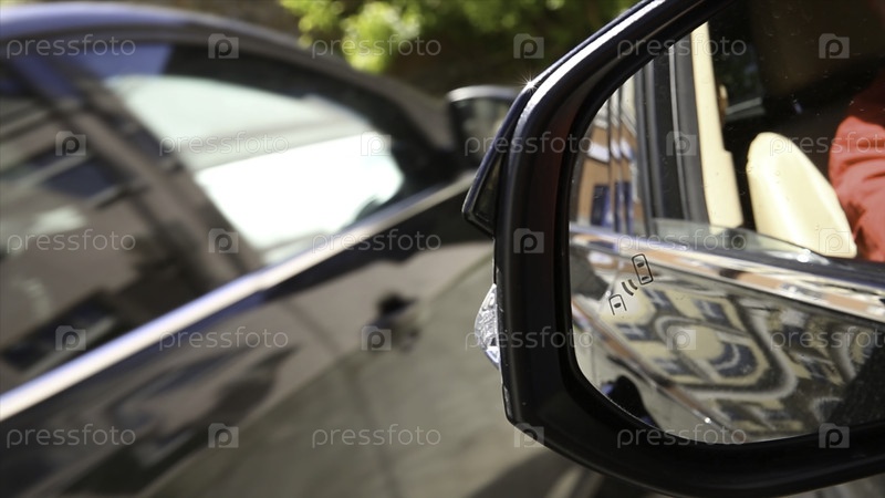 Автономные автомобили на дороге с видимым соединением. Система мониторинга слепых точек предупреждает о значке света в боковом зеркале современного автомобиля
