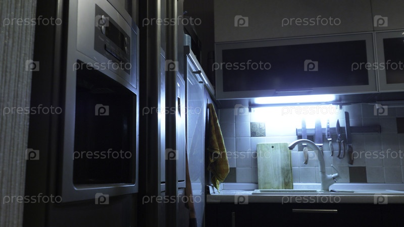 Красивая молодая женщина ищет еду в холодильнике. Красивая женщина открывает холодильник ночью. Холодильник светит во тьме. Ползущая к холодильнику ночью. Концепция правильного питания и диеты