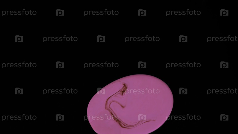 Закройте вид сверху на ярко-розовое овальное пятно, изолированное от черного фона.Небольшое жидкое пятно краски цвета фуксии движется медленно