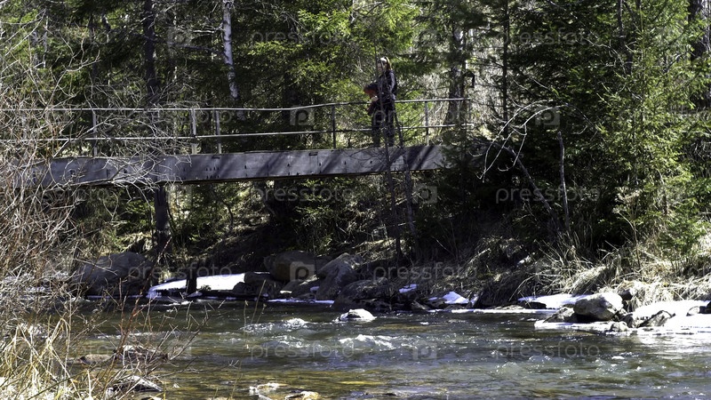 Женщина-путешественница весной на мосту через горную реку.Медиа.Путешественник пересекает железный мост над горной рекой, которая течет после весенних наводнений.Весенние горные пейзажи с лесом