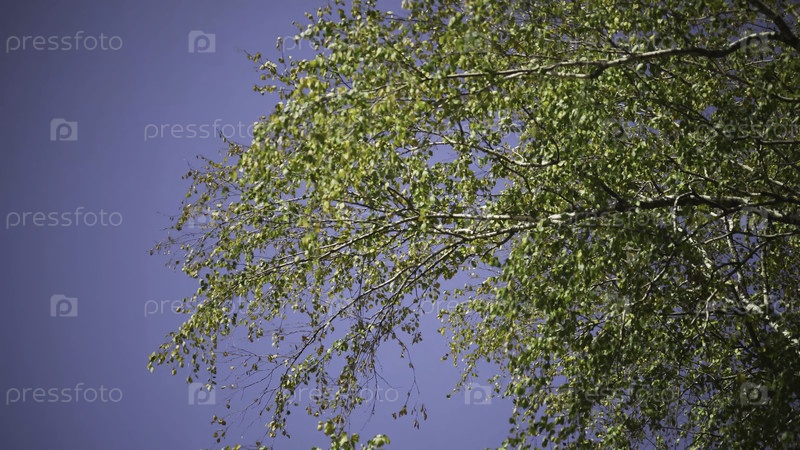 Ветви деревьев с зелеными листьями шелестят против голубого неба. Идите вперед. Красивые и сочные зелёные листья на дрожащих ветвях деревьев. Летние зеленые деревья контрастируют с синим небом