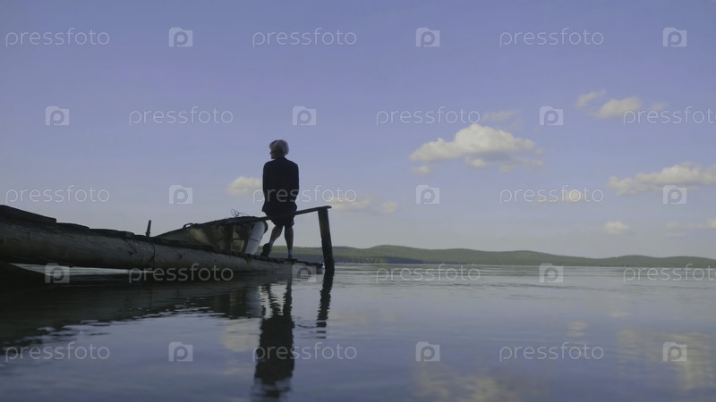 Боковый вид девушки, сидящей на деревянном пирсе на берегу реки. боковое изображение спящей девочки, сидящей на деревянном пире на берегу реки. красивая женщина с блондинками