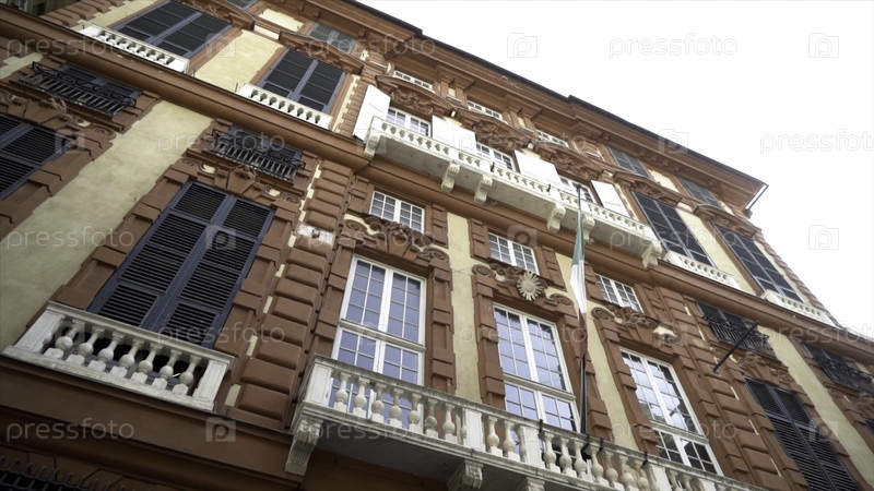 Нижний вид фасада жилого здания со старой европейской архитектурой. Продолжайте. Красивый экстерьер дома со старинной архитектурой и высокими окнами