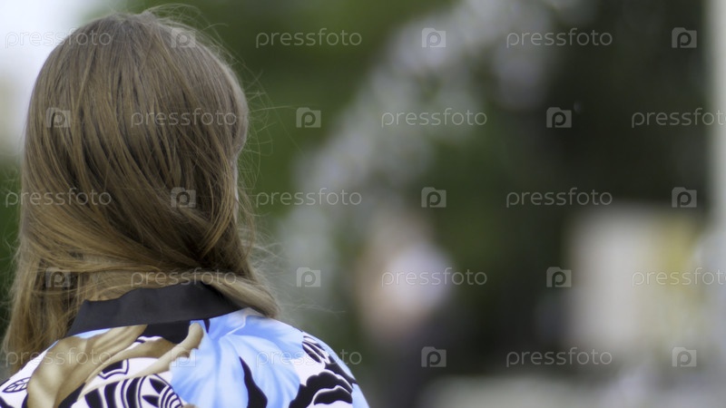 Молодая женщина с длинными коричневыми волосами сидит у фонтана в парке