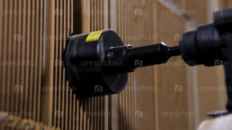 Круглое дно на сверла. резервные кадры. Профессиональная рабочая дрель с круглым дном пробивает отверстие в плотную кирпичную стену. Закрытие рабочей дрели в стене делает большую дыру