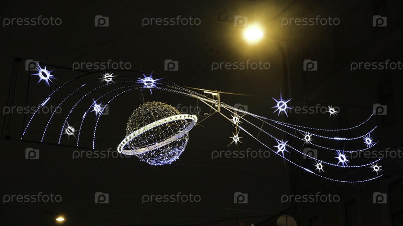 Яркие сверкающие украшения праздничного новогоднего города ночью.Концепция.Светящие декорации с гирляндами освещают ночной город и создают праздничное настроение на Новый год