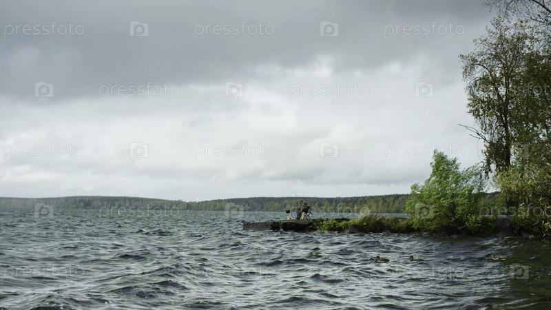 Прекрасный вид рыбака на берегу с морем на фоне горизонта с лесом. Резервные кадры. Рыбалка с прекрасным видом, плавучие утки и раскачивающееся море