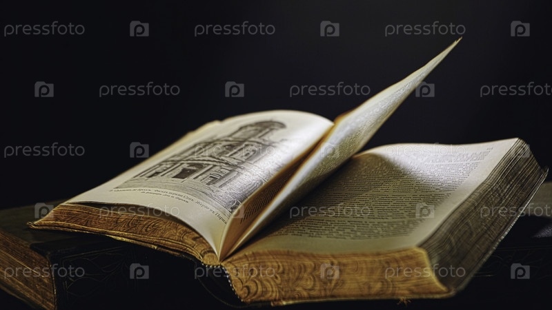 Детали старых книг. резервные записи. Открыть старую книгу, лежащую на столе со страницами, переворачивающимися с ветром