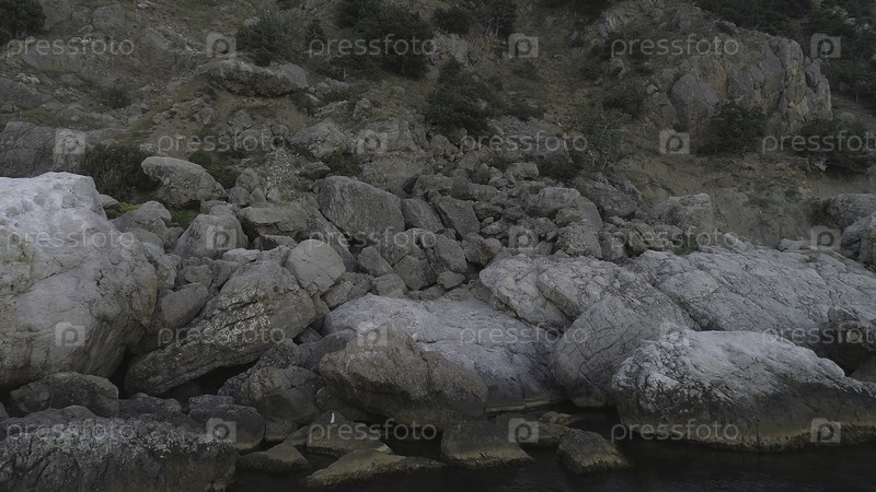 Побережье залива в Белом море Вид на большие белые и серые камни возле склона горы и небольшого ручья или горной реки Каменистая сторона скалы рядом с водой