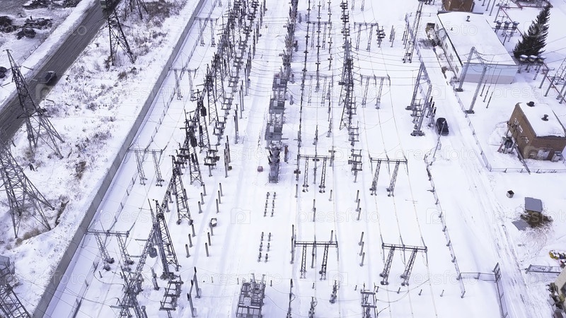 Серия электрических столбов подстанции. Продолжайте. Вид на небольшую электрическую подстанцию с рядом трансформаторов в пригороде. Подвижная электростанция зимой