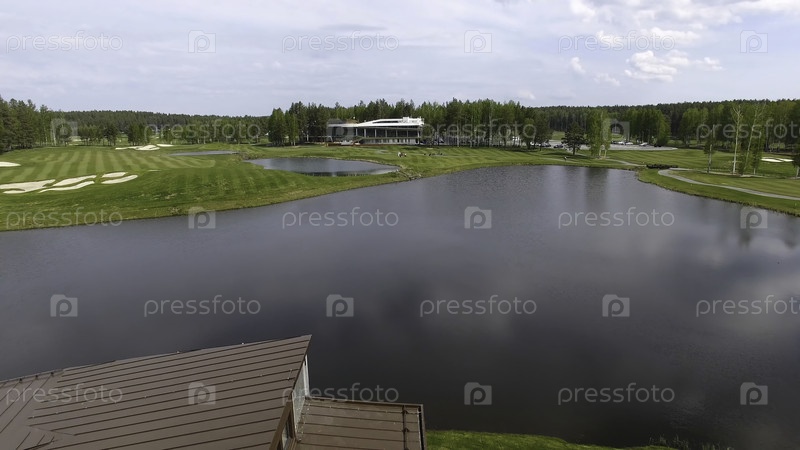 Солнечная коляска для гольфа с облаками в синем небе и лесистым озером Golf Club