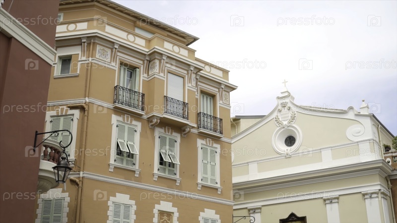 Красивые красочные дома в европейском стиле. Идите дальше. Дома туристического городка с яркой краской и небольшими балконами выходят на улицу. Прекрасная архитектура домов против неба