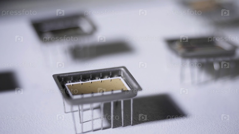 Электронный микрочип с отражающей бронзовой поверхностью на ногах на столе со падающей тенью