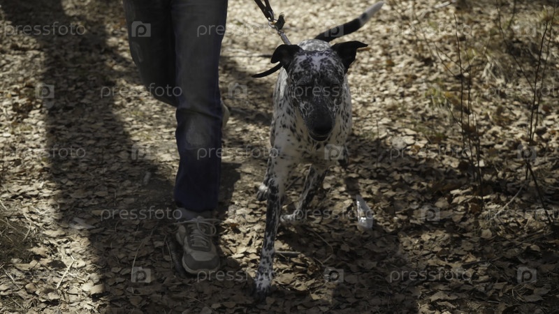 Мужчина в свитере и штанах гуляет на улице с далматинской собакой