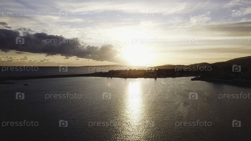 Красивый синий фон заката неба. Сток. Вид сверху на закат в море. Драматический закат у моря