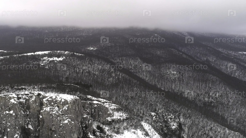 Зимняя сцена в горах. Съемка. Вид на заснеженный горный пейзаж в лесу