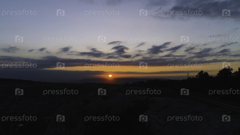 Вид на красный закат с темными горами. Снимай. Удивительное цветное время суток. Огненное солнце, которое садится на вершину холма, отнимает день
