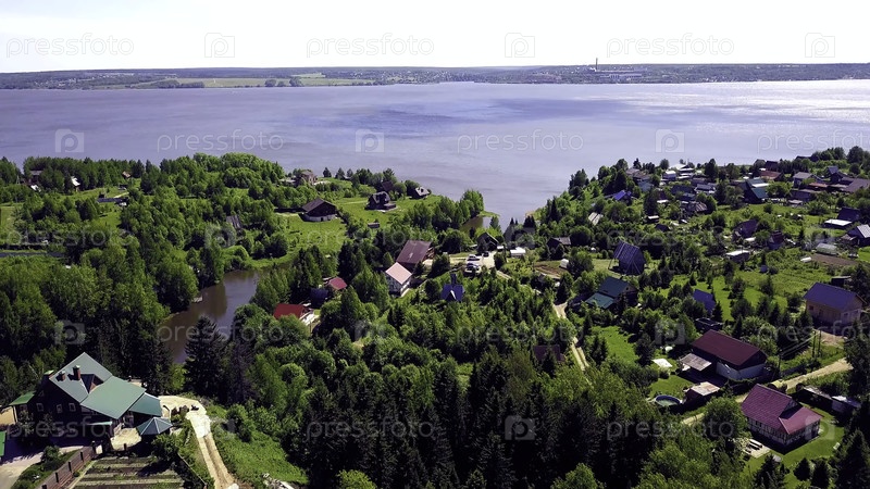 Коттеджный городок на фоне голубого озера.Клип.Вид сельской деревни в лесной местности у озера