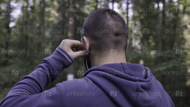 Спортсмен на дороге через лес.Разгляд сзади.Спортсмен на дороге в лесу.Спортсмен, стоящий на тропе по осеннему лесу