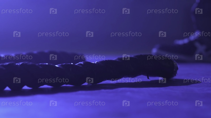 Привлекательный молодой фитнесмен и спортсмен, работающий в функциональном тренажерном зале, выполняет кроссфит с боевыми веревками