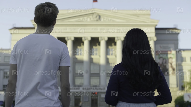 Задний вид портрета двух студентов, несущих прогулку и взгляд на здание. Графика, формула. Обратный вид пары студентов, осматривающих достопримечательности в туристическом направлении с университетом с красочными зданиями на заднем плане