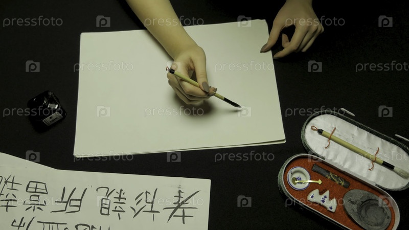 Женская рука пишет китайскую каллиграфию, женщина держит кисть с китайскими символами