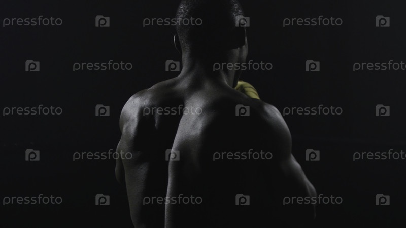 Мускулистый мужчина с заднего вида боксирует на черном фоне молодой афроамериканский боксер, практикующий тень. Боксёр в желтых перчатках