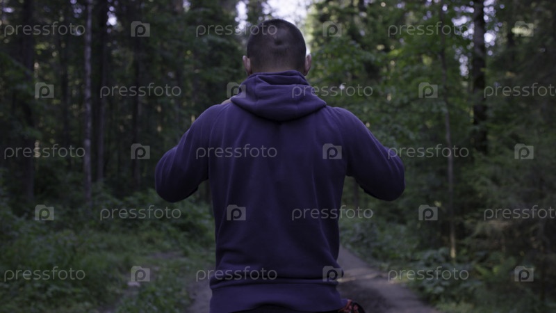 Человек в капюшоне стоит.Человек с капюшоном в лесу.Спорт в лесу на природе