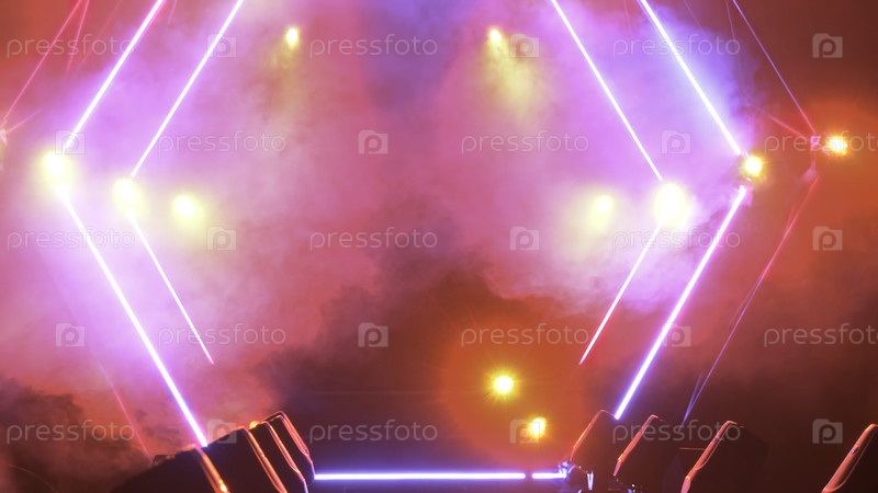 Сцена с дымом и светофорами. Концепция презентации. Современная подиумная дорожка или сцена со светом и дымом