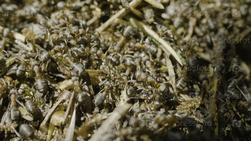 Муравьи строят муравейник. Колония насекомых. Макро. Красные лесные муравьи. Муравейник в лесу крупный план