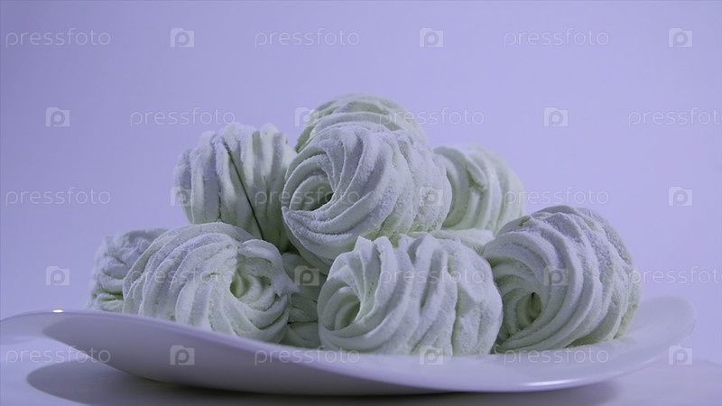 Много зефира на белом телефоне. Розовые пушистые круглые маршмальоны на тонком фоне. Сладкая еда Конфеты Фон в стройном плакате. гобоэ