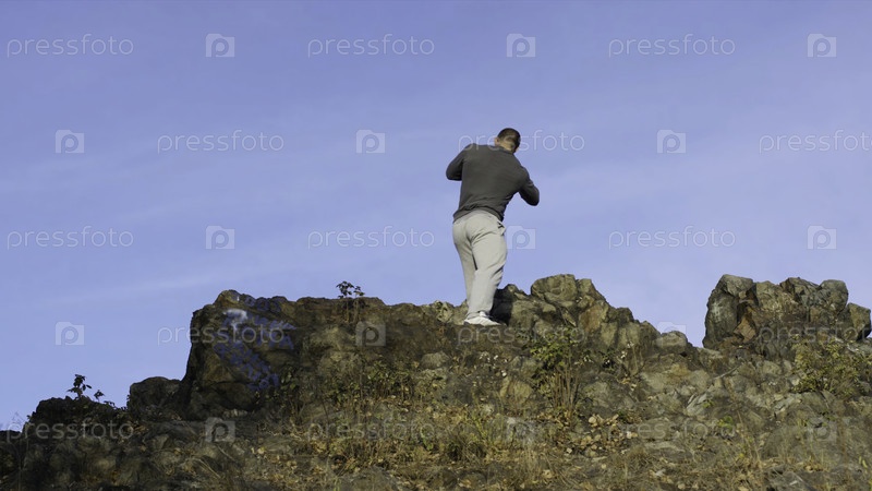 Силуэт боксёра со своей тенью на обрыве при закате солнца сильный мускулистый боксер теневая борьба на задней скале