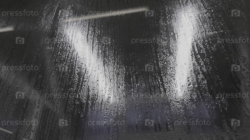 Вода падает на стекло. Капли дождя на черном стеклянном фоне. Естественный рисунок капель дождя. В городе идет дождь. Эффект капли дождя вызывает пар на окне