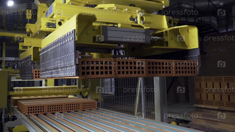 Завод по производству строительного материала с готовым кирпичом, промышленное строительство. Производство кирпичей на фабрике. Рабочий процесс, крупный план. Многие кирпичи