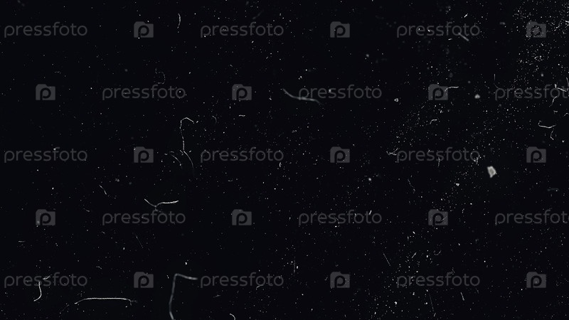 Медленная макрофотосъемка частиц пыли на черном фоне. Белые частицы пыли медленно перемещаются в пространстве на чёрном фоне. Абстрактный движущийся фон частиц. Медленное движение макрочастиц пыли Взрывное течение над черным фоном