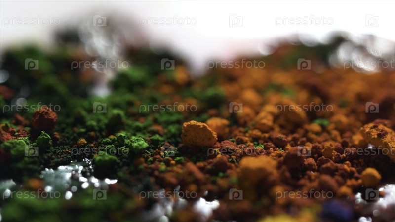 Закрытие различных цветов сухим чернилом, художественная концепция. яркий радужный фон с оранжевым, зеленым и желтым порошком