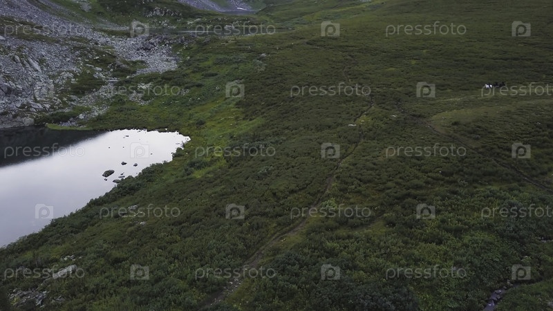Вид с воздуха людей, едущих на лошадях в горном поле. Езда в горах, купание в озере. Лошади ходят по зеленой траве. Авиационный вид верховой езды на горном поле на фоне пруда. Горный пейзаж