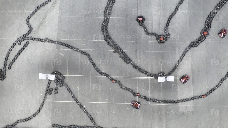 Вид с воздуха картинговой трассы с перемещающимися маленькими красными карточками, концепцией гонок и автоспорта. СМИ. Высочайший вид поворотов на гоночной дорожке