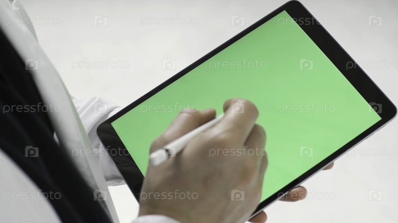Закройте современный черный планшет с зеленым экраном и нажмите на него стилусом, концепция современных технологий. Резервные кадры. Мужчина держит таблетку с хроматической клавиатурой