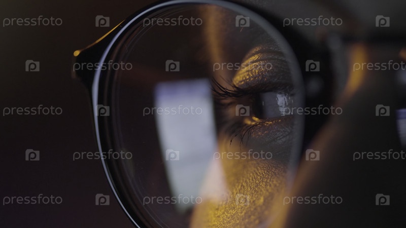 Молодая женщина пишет сообщение на своем телефоне, которое можно увидеть в отражении ее очков
