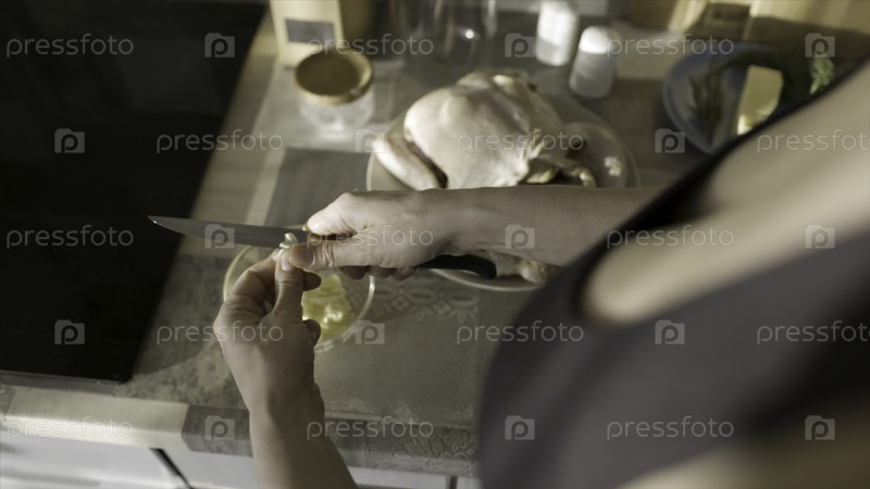 Сексуальная женщина маринуется, готовя чесночную заправку для выпечки курицы. резервные кадры. Покрытие женщины, режущей чеснок ножом дома на кухне, готовляя