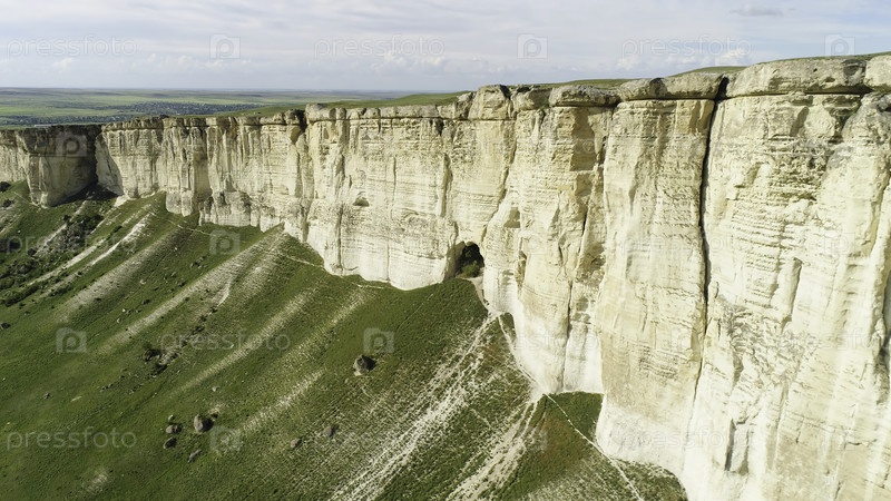 Потрясающий пейзаж Белой скалы в Крыму с ярко-зеленой лужайкой у подножия.Стреляйте.Воздух для красивой горы с плоской вершиной и зеленым полем на фоне облачного неба