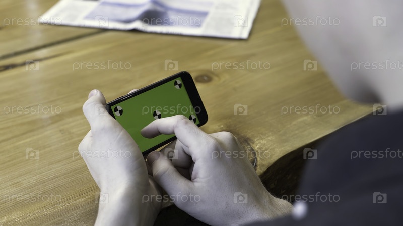 Один парень держит электронный гаджет с зеленым экраном chromakey, прокручивает и нажимает его к деревянному столу.Человек сидит в комнате и использует мобильный телефон