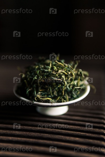 Потрясающий крупный план сушеных листьев зеленого чая, изящно расположенных и красиво представленных в деликатном блюде