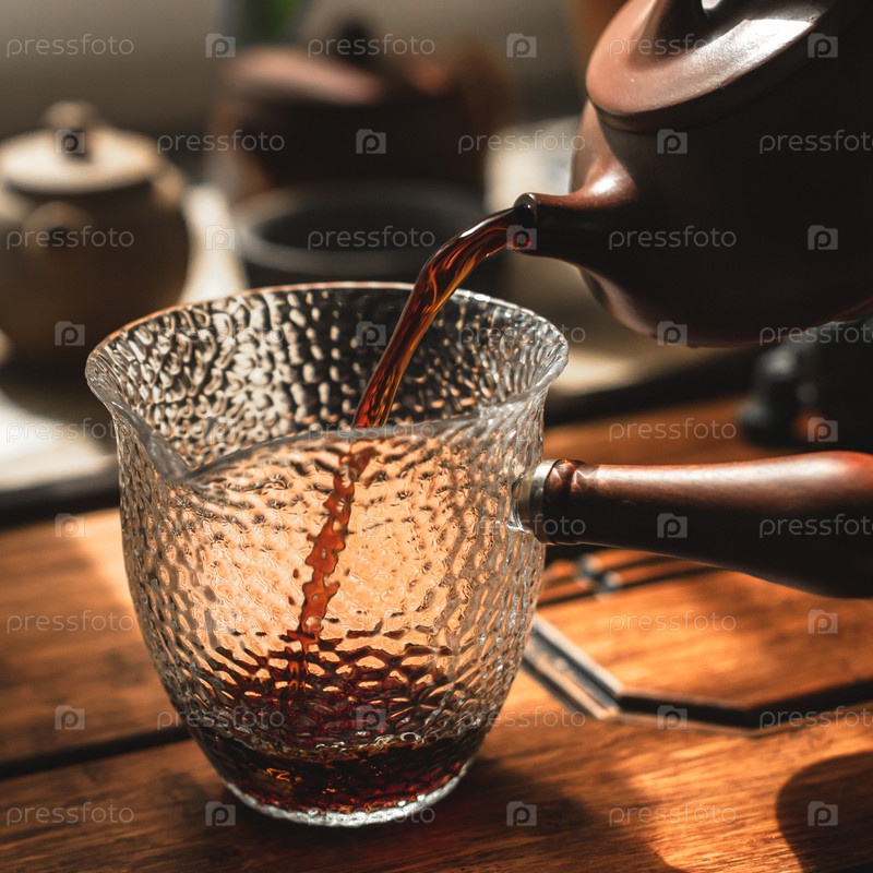 Спокойный момент разворачивается, когда чай наливается в текстурированную стеклянную посуду, захватывая тепло и элегантность в каждой детали