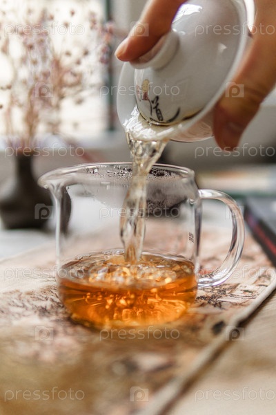 Вливание восхитительной и успокаивающей чашки чая в красиво сделанный стеклянный кувшин приносит блаженство